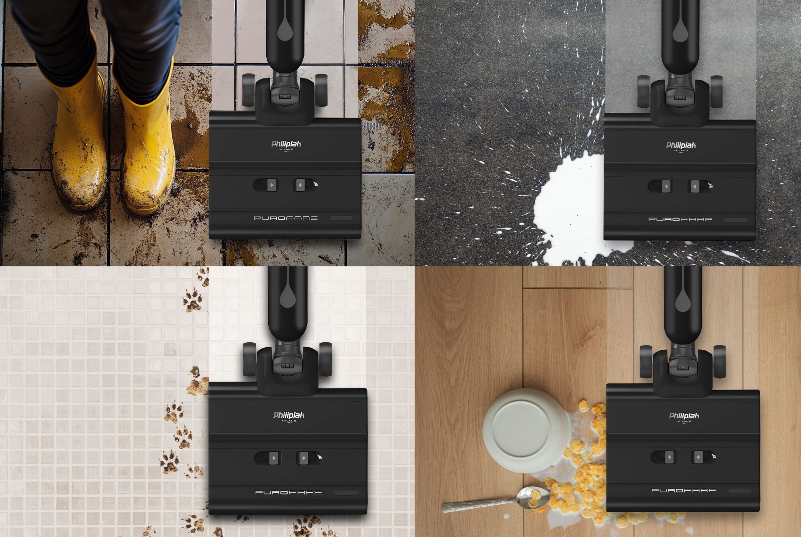 Be amazed at how easily you can maintain perfect cleanliness! Philipiak Purofare effortlessly handles all kinds of mess — hair, pet fur, spilled ketchup, raw egg, flour, coffee, or water disappear in the blink of an eye. Thanks to its innovative bionic technology, it simultaneously washes, vacuums, and collects water, leaving your floor perfectly clean and almost dry. Philipiak Purofare has been designed to effectively clean all types of hard floors, leaving them shiny and hygienically clean – without streaks, smudges, or excess water.