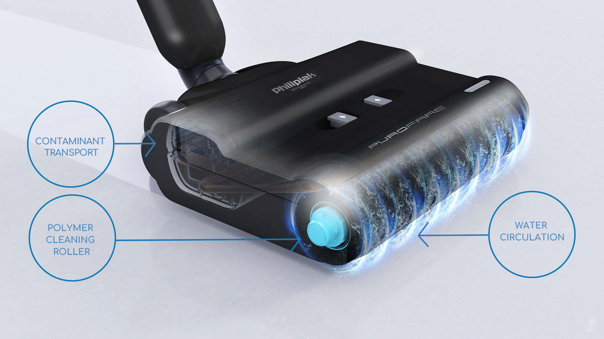 Philipiak Purofare is an exceptionally lightweight, agile, and modern cleaning device featuring a damp polymer washing roller that effectively removes both dry and wet dirt from hard surfaces.